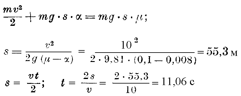 30.7. При подходе к станции поезд идет со скоростью 10 м/с под углон, угол которого α = 0,008 рад. В некоторый момент машинист начинает тормозить поезд. Сопротивление от трения в осях составляет 0,1 от веса поезда. Определить, на каком расстоянии и через какое время от начала торможения поезд остановится. Принять, что sin α = α.