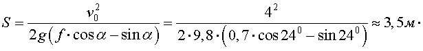 30.3. Тело К находится на шероховатой наклонной плоскости в покое. Угол наклона плоскости к горизонту α = 24° и f0 > tg α, где f0 = 0,75 — коэффициент трения покоя. В некоторый момент телу сообщена начальная скорость v0, направленная вдоль плоскости вниз. Определить путь S, пройденный телом до остановки, если коэффициент трения при движении равен f = 0,7.