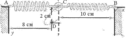 30.18. Две ненапряженные пружины АС и ВС, расположенные по горизонтальной прямой Ах, прикреплены шарнирами к неподвижным точкам A и В, а в точке С — к гире массы 2 кг. Пружина АС сжимается на 1 см силой 20 Н, а пружина СВ вытягивается на 1 см силой 40 Н. Расстояние АС = ВС = 10 см. Гире С сообщена скорость vo = 2 м/с в таком направлении, что при последующем движении она проходит через точку D, координаты которой xD = 8 см, yD = 2 см, если за начало координат принять точку A и координатные оси направить, как указано на