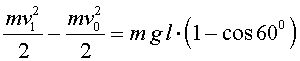 31.17. Груз подвешен на нити длины 0,5 м в неподвижной точке О. В начальном положении М0 груз отклонен от вертикали на угол 60°, и ему сообщена скорость в вертикальной плоскости по перпендикуляру к нити вниз, равная 3,5 м/с.