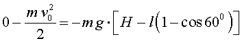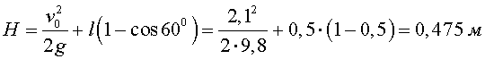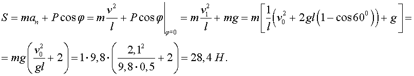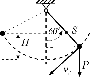 31.1. Груз массы 1 кг подвешен на нити длины 0,5 м в неподвижной точке О. В начальный момент груз отклонен от вертикали на угол 60°, и ему сообщена скорость vo вертикальной плоскости по перпендикуляру к нити вниз, равная 2,1 м/с. Определить натяжение нити в наинизшем положении и отсчитываемую по вертикали высоту, на которую груз поднимается над этим положением.
