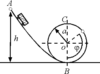 31.3. По рельсам, положенным по пути АВ и образующим затем петлю в виде кругового кольца ВС радиуса а, скатывается вагонетка массы m. С какой высоты h нужно пустить вагонетку без начальной скорости, чтобы она могла пройти всю окружность кольца, не отделяясь от него? Определить давление N вагонетки на кольцо в точке М, для которой