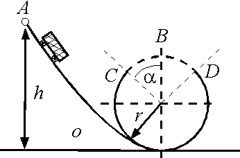 ВОD = α. Найти, с какой высоты h должна скатываться вагонетка без начальной скорости, чтобы она могла пройтц всю петлю, а также то значение угла α, при котором эта высота h наименьшая.