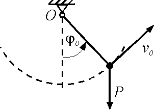 31.9. Тяжелая отливка массы m прикреплена к стержню, который может вращаться без трения вокруг неподвижной оси О и отклонен от вертикали на угол φо. Из этого начального положения отливке сообщают начальную скорость vо (см. рисунок). Определить усилие в стержне как функцию угла отклонения стержня от вертикали пренебрегая массой стержня. Длина стержня l.
