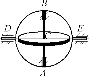 35.1. Определить главный вектор внешних сил, действующих на маховик М, вращающийся вокруг оси АВ. Ось АВ, укрепленная в круговой раме, в свою очередь вращается вокруг оси DE. Центр масс С маховика находится в точке пересечения осей АВ и DE.