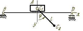 2) закон движения точки С в вертикальном направлении, считая балку упругой с коэффициентом упругости, равным с. В начальный момент балка, будучи недеформированной, находилась в покое в горизонтальном положении. Считая колебания троса малыми, принять: sin φ ≈ φ, cos φ ≈ 1. Начало отсчета оси у взять в положении статического равновесия точки С1. Массой троса и размерами тележки по сравнению с длиной балки пренебречь.