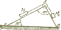 35.19. Два груза M1 и М2, соответственно массы M1 и М2, соединенные нерастяжимой нитью, переброшенной через блок A, скользят по гладким боковым сторонам прямоугольного клина, опирающегося основанием ВС на гладкую горизонтальную плоскость. Найти перемещение клина по горизонтальной плоскости при опускании груза M1 на высоту h = 10 см. Масса клина М = 4, M1 = 16 М2 ; массой нити и блока пренебречь.