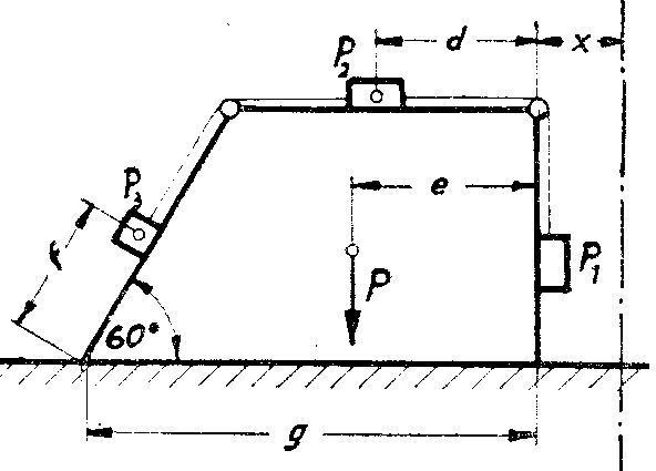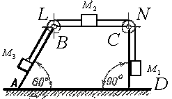 35.20. Три груза массы M1 = 20 кг, M2 = 15 кг и M3 =10 кг соединены нерастяжимой нитью, переброшенной через неподвижные блоки L и N. При опускании груза М1 вниз груз М2 перемещается по верхнему основанию четырехугольной усеченной пирамиды ABCD массы М = 100 кг вправо, а груз М3 поднимается по боковой грани АВ вверх. Пренебрегая трением между усеченной пирамидой ABCD и полом, определить перемещение усеченной пирамиды ABCD относительно пола, если груз M1 опустится вниз на 1 м. Массой нити пренебречь.