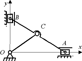 35.2. Определить главный вектор внешних сил, приложенных к линейке АВ эллипсографа, изображенного на рисунке. Кривошип ОС вращается с постоянной угловой скоростью ω, масса линейки АВ равна М, OC = AC = BC = l.