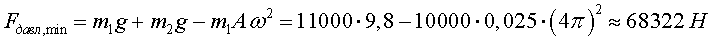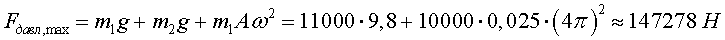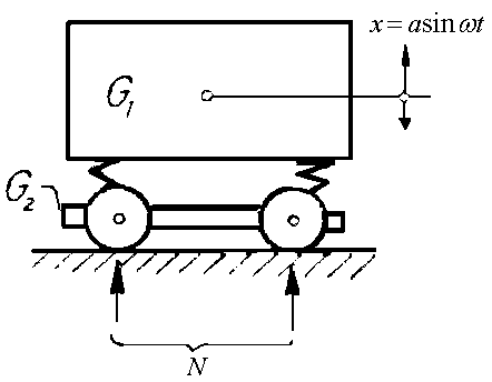 35.6. Вагон трамвая совершает вертикальные гармонические колебания на рессорах амплитуды 2,5 см и периода T = 0,5 с. Масса, кузова с нагрузкой 10 т, масса тележки и колес 1 т. Определить силу давления вагона на рельсы.