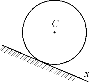35.3. Определить главный вектор внешних сил, действующих на колесо массы М, скатывающееся с наклонной плоскости вниз, если его центр масс С движется по закону xс = at2/2.