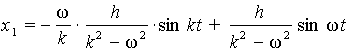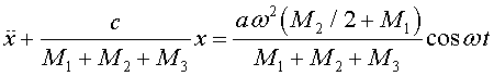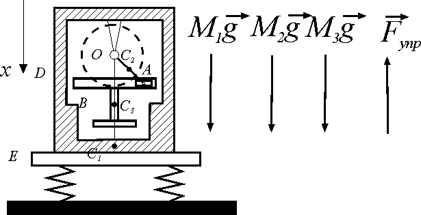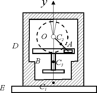 = а, где С1 – центр масс статора A, а С2 – центр масс ротора B. Ротор равномерно вращается с угловой скоростью ω. Электромотор установлен посередине упругой балки, статический прогиб которой равен Δ; M1– масса статора, М2– масса ротора. Найти уравнение движения точки С1 по вертикали, если в начальный момент она находилась в покое в положении статического равновесия. Силами сопротивления пренебречь. Начало отсчета оси х взять в положении статического равновесия