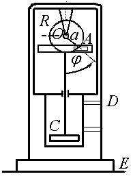 ,35.7. Определить силу давления на грунт насоса для откачки воды при его работе вхолостую, если масса неподвижных частей корпуса D и фундамента E равна М1 и масса кривошипа OA = а равна М2, масса кулисы В и поршня С равна М3. Кривошип ОА, вращающийся равномерно с угловой скоростью ω, считать однородным стержнем.