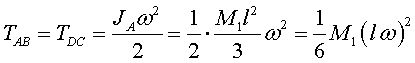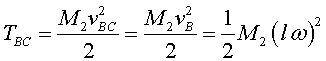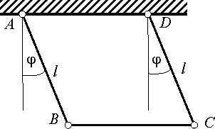 38.1. Вычислить кинетическую энергию плоского механизма, состоящего из трех стержней АВ, ВС и CD, прикрепленных цилиндрическими шарнирами А и D к потолку и соединенных между собой шарнирами В и С. Масса каждого из стержней АВ и CD длины l равна М1, масса стержня ВС равна М2 причем BC = AD. Стержни АВ и DC вращаются с угловой скоростью ω.