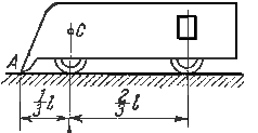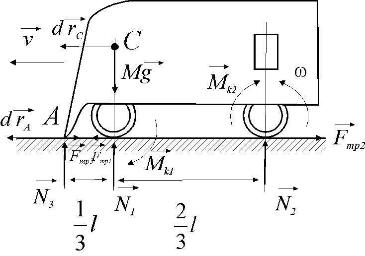 38.12. Машина массы М для шлифовки льда движется равномерно и прямолинейно со скоростью v по горизонтальной плоскости катка. Положение центра масс С указано на рисунке. Вычислить мощность N двигателя, передаваемую на оси колес радиуса r, если fk – коэффициент трения качения между колесами автомашины и льдом, а f – коэффициент трения скольжения между шлифующей кромкой А и льдом. Колеса катятся без скольжения.