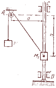 38.16. К концам гибкой нерастяжимой нити, переброшенной через ничтожно малый блок А, подвешены два груза. Груз массы M1 может скользить вдоль гладкого вертикального стержня CD, отстоящего от оси блока на расстоянии а; центр тяжести этого груза в начальный момент находился на одном уровне с осью блока; под действием силы тяжести этот груз начинает опускаться без начальной скорости. Найти зависимость между скоростью первого груза и высотой его опускания h. Масса второго груза равна М.