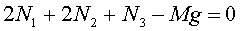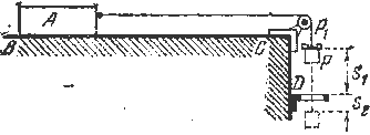 38.17. Груз Р массы М с положенным на него дополнительным грузом массы М1 посредством шнура, перекинутого через блок, приводит в движение из состояния покоя тело А массы М2, находящееся на негладкой горизонтальной плоскости ВС. Опустившись на расстояние s1, груз М приходит через кольцо D, которое снимает дополнительный груз М1 после чего груз М, опустившись на расстояние s2, приходит в состояние покоя. Определить коэффициент трения f между телом A и плоскостью, пренебрегая массой шпура и блока и трением в блоке; дано М2 = 0,8 кг, М = М1 =0,1 кг, s1 = 50 см,s2 = 30 см.