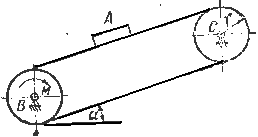38.20. Транспортер приводится в движение из состояния покоя приводом, присоединенным к нижнему шкиву В. Привод сообщает этому шкиву постоянный вращающий момент М. Определить скорость ленты транспортера v в зависимости от ее перемещения s, если масса поднимаемого груза А равна М1, а шкивы В и С радиуса r и массы М2 каждый представляют собой однородные круглые цилиндры. Лента транспортера, массой которой следует пренебречь, образует с горизонтом угол α. Скольжение ленты по шкивам отсутствует.
