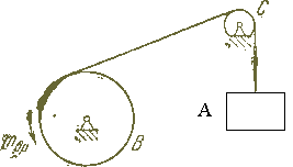 38.24. На рисунке изображен подъемный механизм лебедки. Груз А массы М1 поднимается посредством троса, переброшенного через блок С и навитого на барабан В радиуса r и массы М2. К барабану приложен вращающий момент, который с момента включения пропорционален квадрату угла поворота φ барабана: mвр = аφ2, где а — постоянный коэффициент. Определить скорость груза А в момент, когда он поднимается на высоту h. Массу барабана В считать равномерно распределённой по его ободу. Блок С – сплошной диск массы М3. Массой троса пренебречь. В начальный момент барабан В вращался против хода часовой стрелки с угловой скоростью ωо.