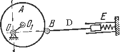 38.28. В кулачковом механизме, расположенном в горизонтальной плоскости, эксцентрик А приводит в возратно-поступательное движение ролик В со штангой D. Пружина Е, соединенная со штангой, обеспечивает постоянный контакт ролика с эксцентриком. Масса эксцентрика равна М, эксцентриситет e ранен половине его радиуса; коэффициент упругости пружины равен с. При крайнем левом положении штанги пружина не напряжена. Какую угловую скорость надо сообщить эксцентрику для того, чтобы он переместил штангу D из крайнего левого в крайнее правое положение? Массой ролика, штанги и пружины пренебречь. Эксцентрик считать однородным круглым диском.