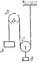 38.30. Груз А массы М1 опускаясь вниз, при помощи троса, перекинутого через неподвижный блок D, поднимает вверх груз В массы М2, прикрепленный к оси подвижного блока С. Блоки С и D считать однородными сплошными дисками массы М3 каждый. Определить скорость груза А в момент, когда он опустится на высоту Н. Массой троса, проскальзыванием по ободам блоков и силами сопротивления пренебречь. В начальный момент система находилась в покое.