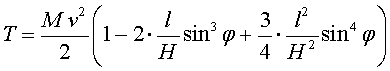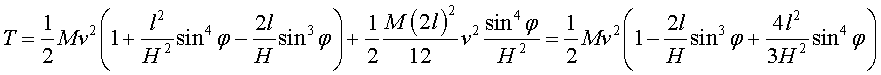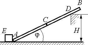 38.2. Однородный тонкий стержень АВ массы M опирается на угол D и концом А скользит по горизонтальной направляющей. Упор Е перемещается вправо с постоянной скоростью v. Определить кинетическую энергию стержня в зависимости от угла φ, если длина стержня равна 2 l, а превышение угла D над горизонтальной направляющей равно Н.