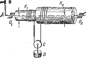 38.35. В дифференциальном вороте два жестко соединенных вала К1 и К2 с радиусами r1 и r2 и моментами инерции относительно оси О1О2 соответственно J1 и J2 приводятся во вращение рукояткой АВ. Подвижный блок С подвешен на невесомой нерастяжимой нити, левая ветвь которой навита на вал К1, а правая ветвь – на вал К2. При вращении рукоятки АВ левая ветвь нити сматывается с вала К1, а правая ветвь наматывается на вал К2. К рукоятке АВ приложен постоянный вращающий момент m. К блоку С подвешен груз D массы М. Найти угловую скорость вращения рукоятки в момент, соответствующий концу подъема груза D на высоту s. В начальный момент система находилась в нокое. Массами рукоятки и блока пренебречь.