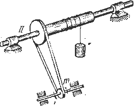 38.36. Ворот приводится в движение посредством ременной передачи, соединяющей шкив II, сидящий на валу ворота, со шкивом I, сидящим на валу мотора. К шкиву I массы М1 и радиуса r приложен постоянный вращающий момент m. Масса шкива II равна M2, радиус его R. Масса барабана ворота М3, радиус его r, масса поднимаемого груза M4. Ворот приводится в движение из состояния покоя. Найти скорость груза в момент, когда он поднимается на высоту h, Массами ремня, каната и трением в подшипниках пренебречь. Шкивы и барабан считать однородными круглыми цилиндрами.