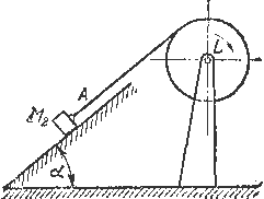 38.38. Постоянный вращающий момент L приложен к барабану ворота радиуса r и массы M1. К концу А намотанного на барабан троса привязан груз массы М2, который поднимается по наклонной плоскости, расположенной под углом α к горизонту. Какую угловую скорость приобретет барабан ворота, повернувшись на угол φ? Коэффициент трения скольжения груза о наклонную плоскость равен f. Массой троса пренебречь, барабан считать однородным круглым цилиндром. В начальный момент система была в покое.