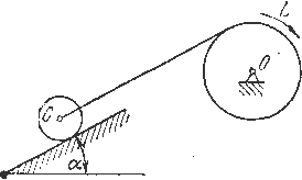 38.40. К барабану ворота радиуса r1 и массы М1 приложен постоянный вращающий момент L. К концу троса, намотанного на барабан, прикреплена ось С колеса массы М2. Колесо катится без скольжения вверх по наклонной плоскости, расположенной под углом α к горизонту. Какую угловую скорость приобретет барабан, сделав n оборотов? Барабан и колесо считать однородными круглыми цилиндрами. В начальный момент система находилась в покое. Массой троса и трением пренебречь.