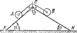 38.42. Колесо А скатывается без скольжения по наклонной плоскости ОК, поднимая посредством нерастяжимого троса колесо В, которое катится без скольжения по наклонной плоскости ОN. Трос переброшен через блок С, вращающийся округ неподвижной горизонтальной оси О. Найти скорость оси колеса А при ее перемещении параллельно линии ОК наибольшего ската наклонной плоскости на расстояние s. В начальный момент система была в покое. Оба колеса и блок считать однородными дисками одинаковой массы и радиуса. Массой троса пренебречь.