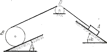 38.44. К грузу А массы M1 прикреплена нерастяжимая нить, переброшенная через блок D массы М2 и намотанная на боковую поверхность цилиндрического катка В массы М3. При движении груза А вниз по наклонной плоскости, расположенной под углом α к горизонту, вращается блок D, а каток В катится без скольжения вверх по наклонной плоскости, образующей с горизонтом угол β. Определить скорость груза A в зависимости от пройденного им пути s, если в начальный момент система находилась в покое. Блок D и каток В считать однородными круглыми цилиндрами. Силами трения и массой нити пренебречь.