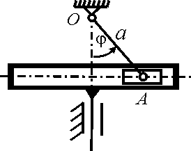 38.3. Вычислить кинетическую энергию кулисного механизма, если момент инерции кривошипа ОА относительно оси вращения, перпендикулярной плоскости рисунка, равен Jо; длина кривошипа равна а, масса кулисы равна m, массой камня А пренебречь. Кривошип ОА вращается с угловой скоростью ω. При каких положениях механизма кинетическая энергия достигает наибольшего и наименьшего значений?