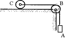 38.47. Груз А массы М1 подвешен к однородному нерастяжимому канату длины L и массы М2. Канат переброшен через блок В, вращающийся вокруг оси О, перпендикулярной плоскости рисунка. Второй конец каната прикреплен к оси катка С, катящегося без скольжения по неподвижной плоскости. Блок В и каток С – однородные круглые, диски радиуса r и массы М3 каждый. Коэффициент трения качения катка С о горизонтальную плоскость равен fk. В начальный момент, когда система находилась в покое, с блока В свисала часть каната длины l. Определить скорость груза А в зависимости от его вертикального перемещения h.