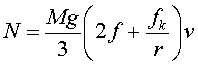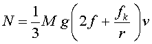 38.11. Автомобиль массы М движется прямолинейно по горизонтальной дороге со скоростью v. Коэффициент трения качения между колесами автомобиля и дорогой равен fk, радиус колес r, сила аэродинамического сопротивления Rc воздуха пропорциональна квадрату скорости: Rc = μ M v2, где μ – коэффициент, зависящий от формы автомобиля. Определить мощность N двигателя, передаваемую иа оси ведущих колес, в установившемся режиме.