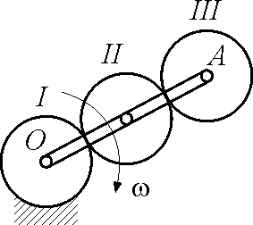 38.7. Планетарный механизм, расположенный с горизонтальной плоскости, приводится в движение кривошипом ОА, соединяющим оси трех одинаковых колес I, II и III. Колесо I неподвижно; кривошип вращается с угловой скоростью ω. Масса каждого из колес равна М1 радиус каждого из колес равен r, масса кривошипа равна M2. Вычислить кинетическую энергию механизма, считая колеса однородными дисками, а кривошип – однородным стержнем. Чему равна работа пары сил, приложенной к колесу III?