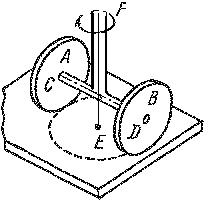 38.8. Мельничные бегуны А к В насажены на горизонтальную ось CD, которая вращается вокруг вертикальной оси EF; масса каждого бегуна 200 кг; диаметры бегунов одинаковы, каждый равен 1 м; расстояние между ними CD равно 1 м. Найти кинетическую энергию бегунов, когда ось CD совершает 20 об/мин, допуская, что при вычислении моментов инерции бегуны можно рассматривать как однородные тонкие диски.
