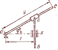 38.9. В кулисном механизме при качании рычага ОС вокруг оси О, перпендикулярной плоскости рисунка, ползун А, Перемещаясь вдоль рычага ОС, приводит в движение стержень АВ, движущийся в вертикальных направляющих К. Рычаг ОС длины R считать однородным стержнем с массою m1, масса Ползуна равна m2, масса стержня АВ равна m3, ОК = l. Выразить кинетическую энергию механизма в функции от угловой скорости и угла поворота рычага ОС. Ползун считать точечной массой.