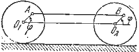 38.10. Вычислить кинетическую энергию системы, состоящей из двух колес, соединенных паровозным спарником АВ и стержнем О1О2, если оси колес движутся со скоростью v0. Масса каждого колеса равна М1, Спарник АВ и соединительный стержень О1О2 имеют одинаковую массу М2. Масса колес равномерно распределена по их ободам; О1А = О2В = r/2, где r — радиус колеса. Колеса катятся без скольжения по прямолинейному рельсу.