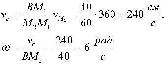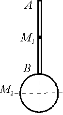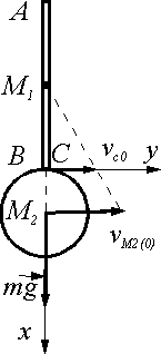 39.1. Тяжелое тело состоит из стержня АВ длины 80 см и массы 1 кг и прикрепленного к нему диска радиуса 20 см и массы 2 кг. В начальный момент при вертикальном положении стержня телу сообщено такое движение, что скорость центра масс М1 стержня равна нулю, а скорость центра масс М2 диска равна 360 см/с и направлена по горизонтали вправо. Найти последующее движение тела, принимая во внимание только действие силы тяжести.