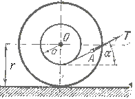 49.15. На барабан однородного катка массы М и радиуса r, лежащего на горизонтальном шероховатом полу, намотана нить, к которой приложена сила Т под углом α к горизонту. Радиус барабана а, радиус инерции катка ρ. Определить закон движения оси катка О, В начальный момент каток находился в покое, затем катился без скольжения.