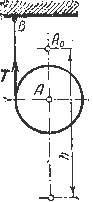 39.19. Тяжелый круглый цилиндр А массы m обмотан посредине тонкой нитью, конец которой В закреплен неподвижно. Цилиндр падает без начальной скорости, разматывая нить. Определить скорость оси цилиндра, после того как эта ось опустится на высоту h, и найти натяжение Т нити.