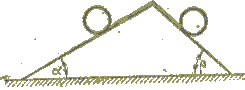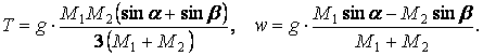 39.21. Два цилиндрических вала массы M1 и М2 скатываются по двум наклонным плоскостям, образующим соответственно углы α и β с горизонтом. Валы соединены нерастяжимой питью, концы которой намотаны на валы и к ним прикреплены. Определить натяжение нити и ее ускорение при движении по наклонным плоскостям. Валы считать однородными круглыми цилиндрами. Массой нити пренебречь.