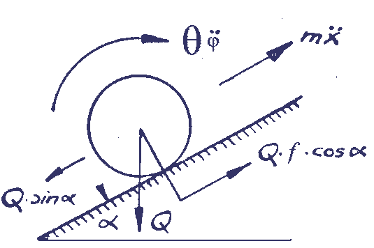 39.13. Однородный цилиндр с горизонтальной осью cкатыипется под действием силы тяжести со скольжением по наклонной плоскости при коэффициенте трения скольжения f. Опрсделить угол наклона плоскости к горизонту и ускорение оси цилиндра.