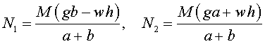 41.13. Автомобиль массы М движется прямолинейно с ускорением w. Определить вертикальное давление передних и задних колес автомобиля, если его центр масс С находится на высоте h от поверхности грунта. Расстояния передней и задней осей автомобиля от вертикали, проходящей через центр масс, соответственно равны а и b. Массами колёс пренебречь. Как должен двигаться автомобиль, чтобы давления передних и задних колес оказались равными?