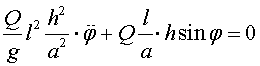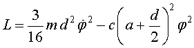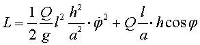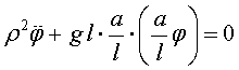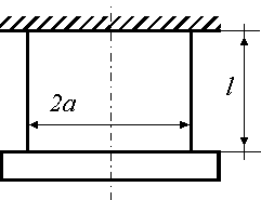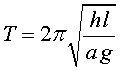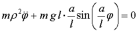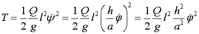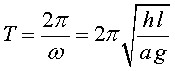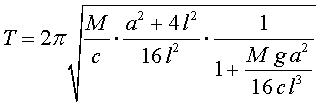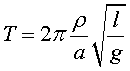 | 54.7. Тело, подвешенное на двух вертикальных нитях длины l каждая, расстояние между которыми 2а, закручивается вокруг вертикальной оси, лежащей в плоскости нитей и равноудаленной от них (бифилярный подвес). Радиус инерции тела относительно оси вращения ρ. Найти период малых колебаний. Ответ: . Решение. |