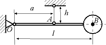 | 54.1. Жесткий стержень ОВ длины l может свободно качаться на шаровом шарнире около конца О и несет шарик веса Q на другом конце. Стержень удерживается в горизонтальном положении посредством нерастяжимого вертикального шнура длины h. Расстояние ОА = а. Если шарик оттянуть перпенпикулярно плоскости рисунка и загем отпустить, то система начнет колебаться. Пренебрегая массой стержня, определить период малых колебаний системы. Ответ: . Решение. |