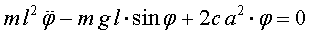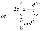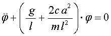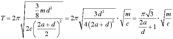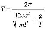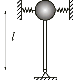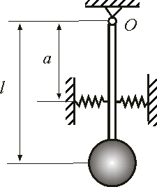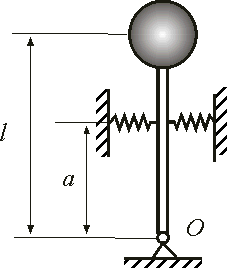 | 54.3. Маятник состоит из жесткого стержня длины l, несущего массу m на своем конце. К стержню прикреплены две пружины жесткостц с на расстоянии а от его верхнего концам противоположные концы пружин закреплены. Пренебрегая массой стержня, найти период малых колебаний маятника. Ответ: . Решение. |