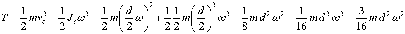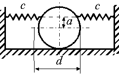 | 54.5. Цилиндр диаметра d и массы m может катиться без скольжения по горизонтальной плоскости. Две одинаковые пружины жесткости с прикреплены посредине его длины на расстоянии а от оси цилиндра; противоположные, концы пружин закреплены. Определить период малых колебаний цилиндра. Ответ: Решение. . |