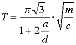| 54.8. Круглый обруч подвешен к трем неподвижным точкам тремя одинаковыми нерастяжимыми нитями длины l так, что плоскость обруча горизонтальна. Нити в положении равновесия обруча вертикальны и делят окружность обруча на три равные части. Найти период малых колебаний обруча вокруг оси, проходящей через центр обруча. Ответ: . |